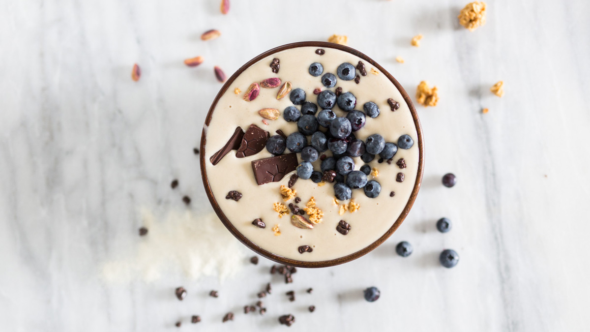 - Pour mixture into bowl, and sprinkle toppings as desired.